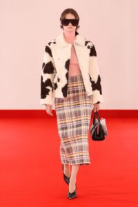 La inspiración principal es Texas, el estado natal de Maxwell. Esto se tradujo en una reinterpretación de elementos clásicos del sur, como los estampados de cuadros, las flores, el icónico estampado de vaca y los flecos. Sin embargo, estas piezas no se quedaron en lo rural; fueron elevadas con la sofisticación de la gran ciudad, incorporando denim de alta costura, sastrería impecable y destellos de lentejuelas. El punto culminante del desfile fue el debut de sus bolsos, un hito que marca la expansión de su universo creativo más allá de las prendas de vestir.