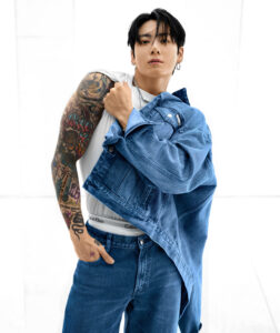 Fotografiada por Mert Alas, la campaña muestra a Jungkook con una imagen más madura y arriesgada. En las fotografías, luce mezclilla oscura, camisetas ajustadas y chaquetas inspiradas en los años noventa, acompañadas de piercings y tatuajes que reflejan una estética más cruda y auténtica. Esta propuesta busca resaltar la esencia de Calvin Klein: minimalismo, sensualidad y confianza.
