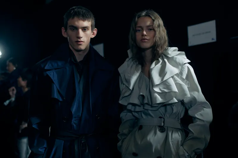 En el corazón de la colección están los clásicos, reinterpretados con una sensibilidad contemporánea. Lee explora texturas, largos y volúmenes, desde versiones con cuellos volantes y detalles de fringe que evocan gotas de lluvia, hasta piezas tejidas y combinadas con cinturones de cuero que aportan un aire sofisticado y práctico. Algunos trenchs incluso llevan grabados mapas de Londres —una oda directa a la ciudad que los vio desfilar—, integrando diseño y geografía de forma sorprendente.