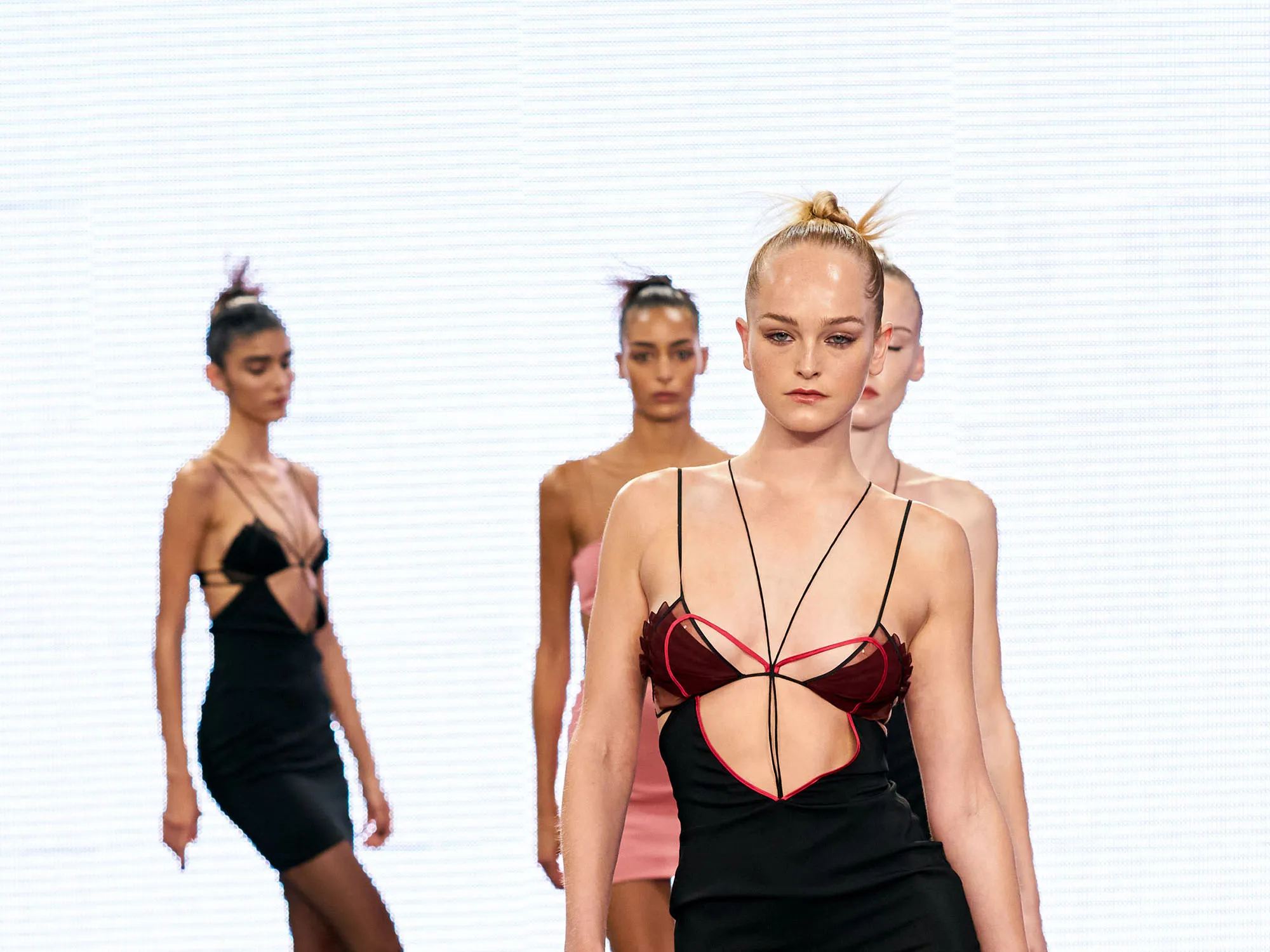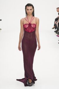 Por su parte, Nensi Dojaka, nacida en Albania pero formada en Londres y adoptada por la escena italiana, se ha convertido en símbolo del nuevo minimalismo sensual. Su dominio de la transparencia y el corte técnico define a una generación que busca poder sin perder sutileza.
