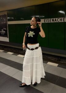 Si hay una prenda que captura el espíritu libre y romántico del otoño 2025, es la falda larga de campana. Este clásico del estilo boho regresa con fuerza para llenar las calles de movimiento, color y textura. Su silueta amplia y fluida, inspirada en la estética de los años setenta, vuelve a ser protagonista en pasarelas y looks urbanos, reinterpretada con un toque más sofisticado y consciente.