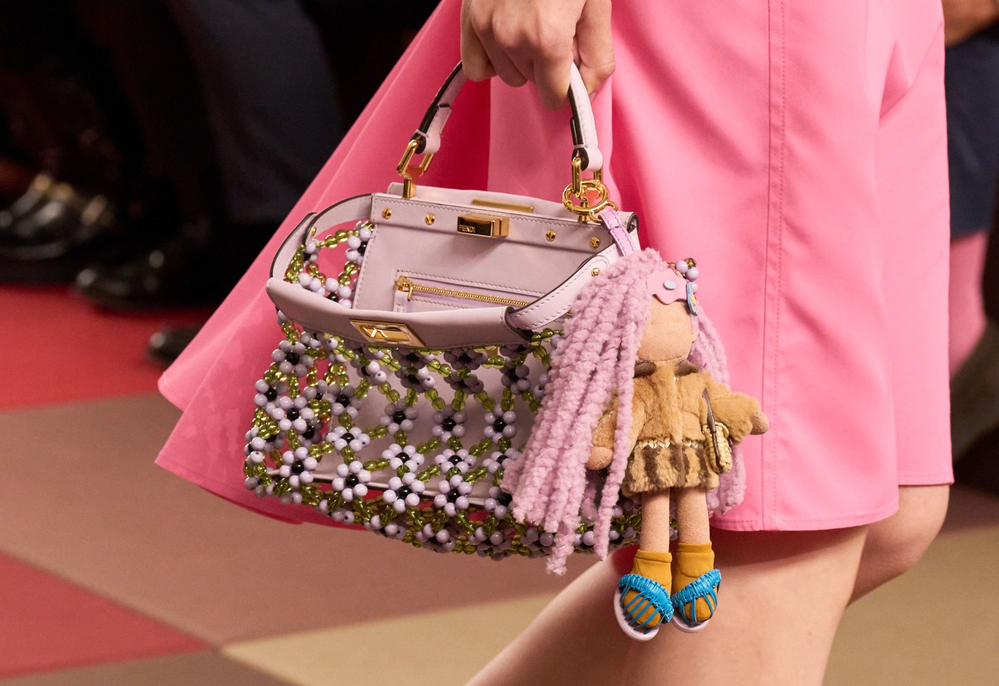 Además, la colección presentó una reinterpretación del icónico bolso Peekaboo, con interiores de lentejuelas y detalles sorprendentes, y prendas confeccionadas con cuero perforado y faldas con cremalleras deportivas, que demostraron la maestría artesanal de la casa. La diseñadora también incorporó cintillos de grosgrain ajustables, típicos de la ropa infantil, para aportar definición y elegancia a las siluetas.