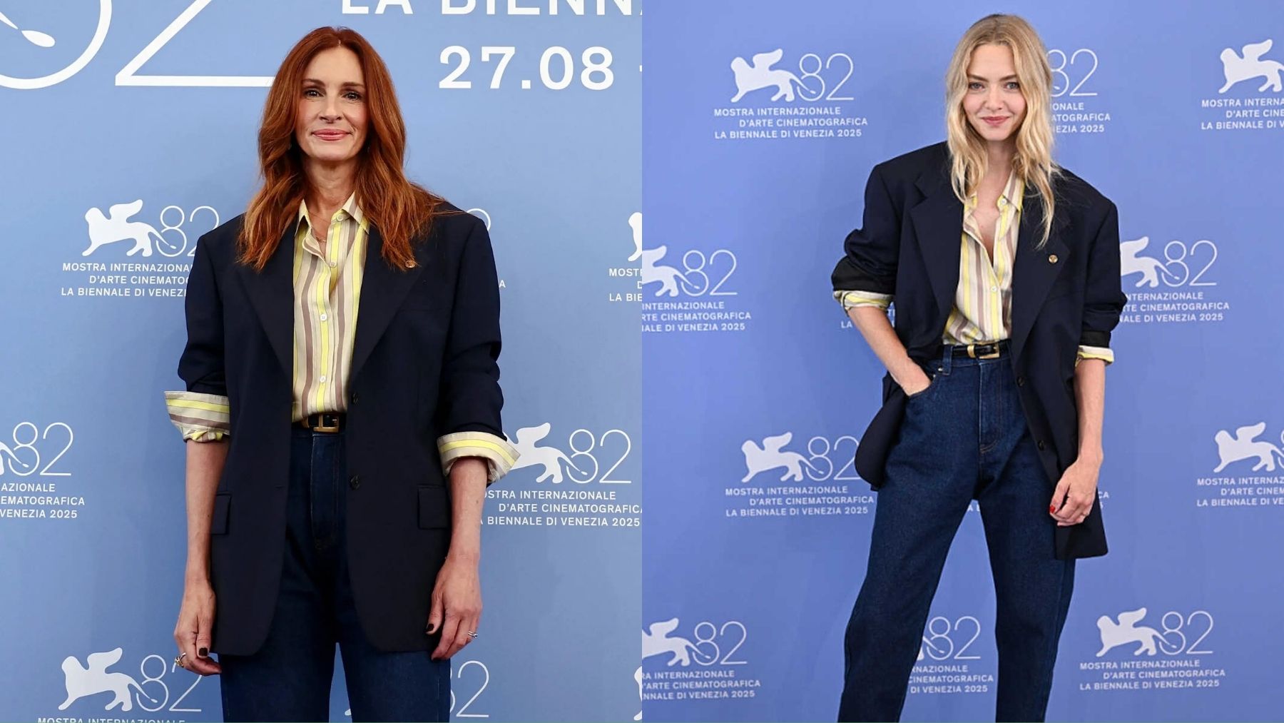 El mundo de la moda ha puesto sus ojos en Julia Roberts y Amanda Seyfried, protagonistas de uno de los momentos más comentados en el marco del Festival de Venecia. Ambas actrices aparecieron con un atuendo idéntico: blazer oversize, camisa blanca y jeans, todos firmados por Dario Vitale, el nuevo director creativo de Versace.