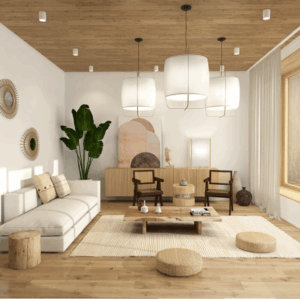 Se inclina por tonos neutros y suaves. Se usan blancos, grises, beiges y colores tierra que crean un ambiente sereno y luminoso. Los acentos de color se introducen con moderación a través de elementos naturales, como plantas o textiles de lino.