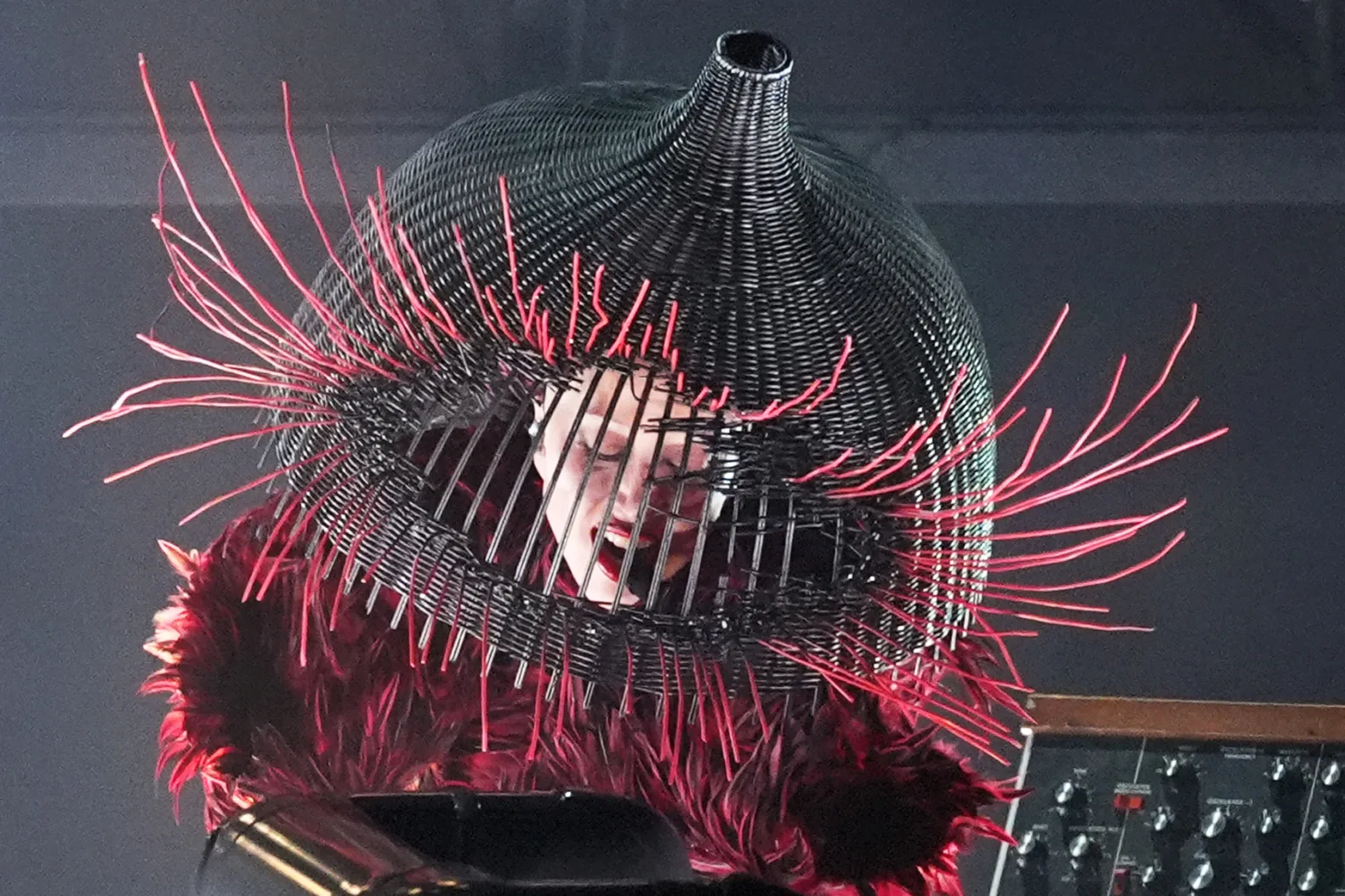 La artista llegó con un vestido negro completamente cubierto de plumas, diseñado a medida por la casa de moda avant-garde Matières Fécales, que le dio un aire de “Cisne Negro” moderno y teatral. La pieza, con una silueta tipo sirena y una larga cola de tul y plumas, destacó por su dramatismo y sofisticación, fusionando alta costura con una estética oscura y elegante.