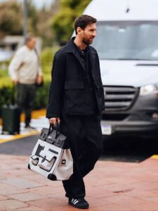 Lionel Messi sorprendió recientemente al ser fotografiado con un accesorio que generó conversación en redes sociales: un bolso HAC Birkin de Hermès. El jugador argentino, vestido en un look monocromático negro compuesto por chaqueta utilitaria y zapatillas adidas clásicas, dejó que la atención recayera en el bolso, considerado uno de los más exclusivos del mundo.