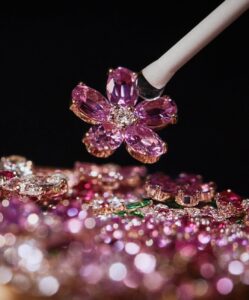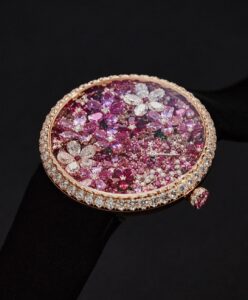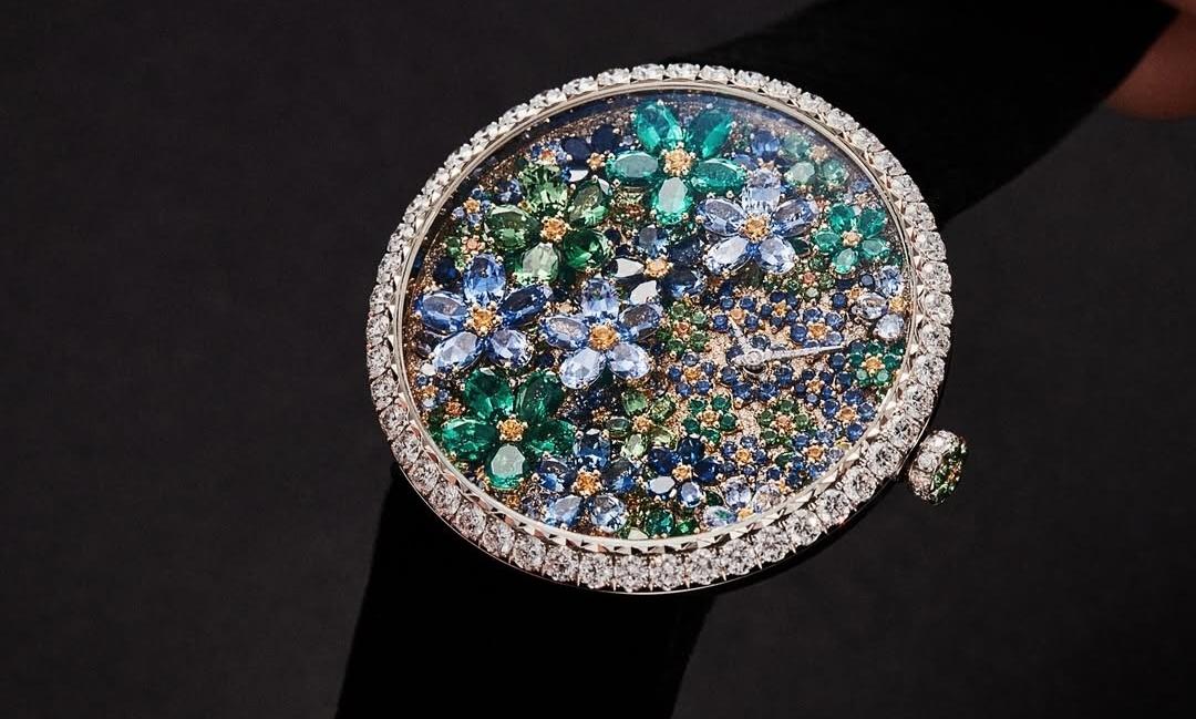 La esfera es un verdadero jardín de gemas, donde diamantes y zafiros de diferentes tonos se entrelazan para formar un follaje tridimensional. Cada gema está cortada y engastada con precisión para imitar la vitalidad de las flores y las hojas, demostrando un extraordinario savoir-faire de la relojería y la joyería.
