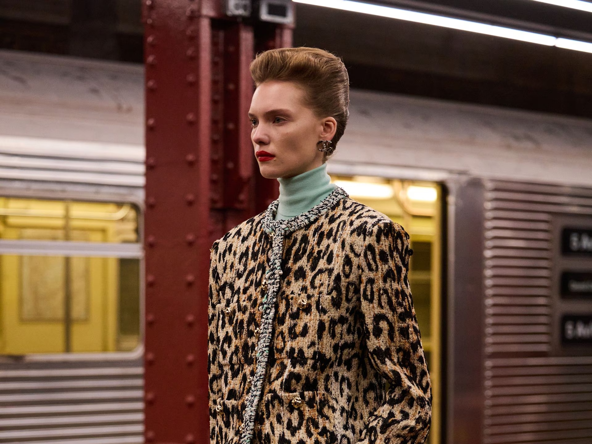 Blazy, quien vivió y trabajó en Nueva York en el pasado, quiso rendir homenaje a la energía de la ciudad. La puesta en escena convirtió la estación en un escenario cinematográfico donde modelos y personajes parecían convivir en un día común del metro, con vagones detenidos, luces industriales y los icónicos mosaicos neoyorquinos como telón de fondo. La colección mezcló la herencia de la firma —tweed trabajado por los artesanos, bordados minuciosos, sastrería impecable— con guiños pop a la cultura local, desde camisetas tipo I NY hasta colores vibrantes y estampados inspirados en los años 30, cuando Coco Chanel visitó Estados Unidos.